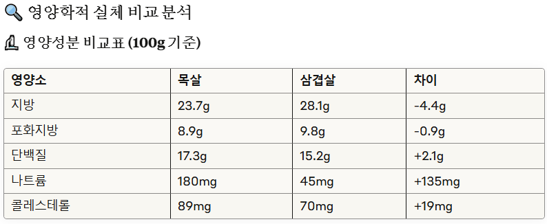 - 목살의 나트륨이 삼겹살보다 4배 높음 (혈압에 더 부담)
